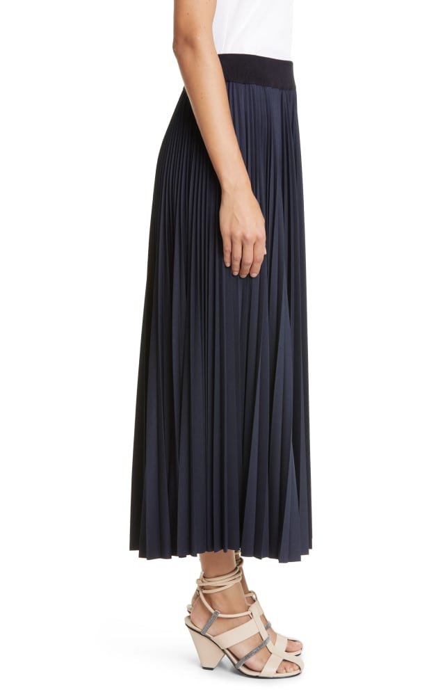 Swirled with plenty of pleats and rendered in a classic shade of navy blue, this casually elegant skirt seeks out opportunities to twirl at every turn.